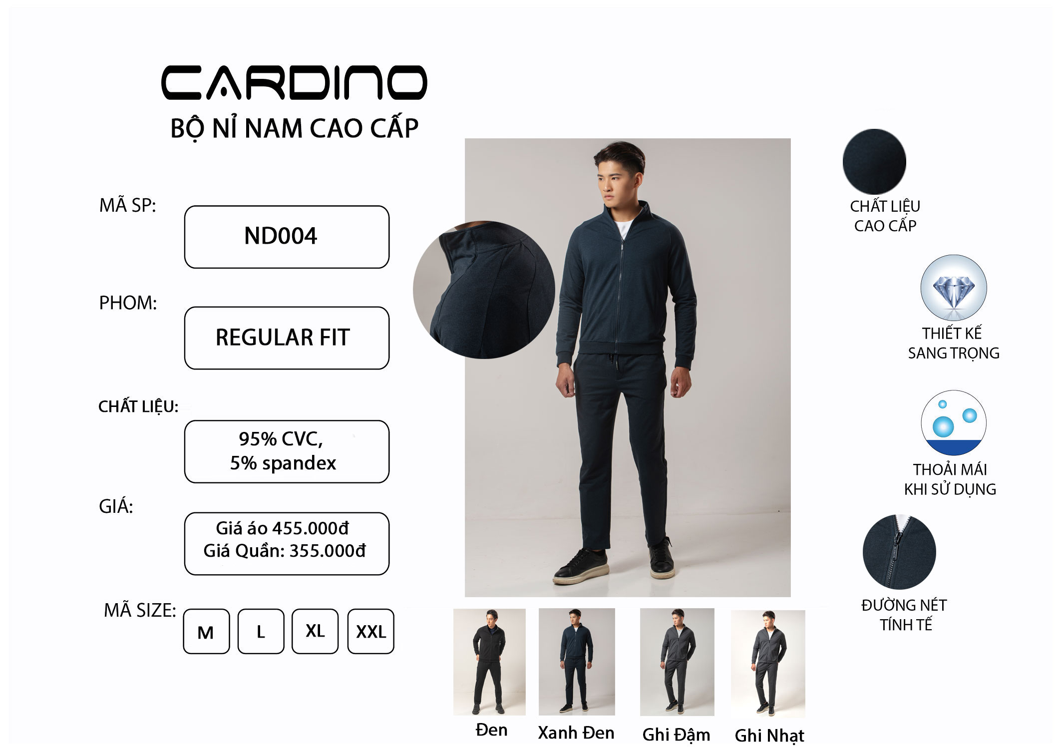 Trong bộ sưu tập mùa đông 2019, Cardino mang đến cho khách hàng bộ nỉ nam cao cấp với thiết kế Regulat Fit tiện dụng, khi là lựa chọn phổ biến cho giới trẻ độ tuổi 30-55, vừa thể hiện sự trẻ trung, năng động lại không kém phần nam tính, có thể vận dụng đi làm, đi chơi hay đi dạo cũng rất lịch sự.