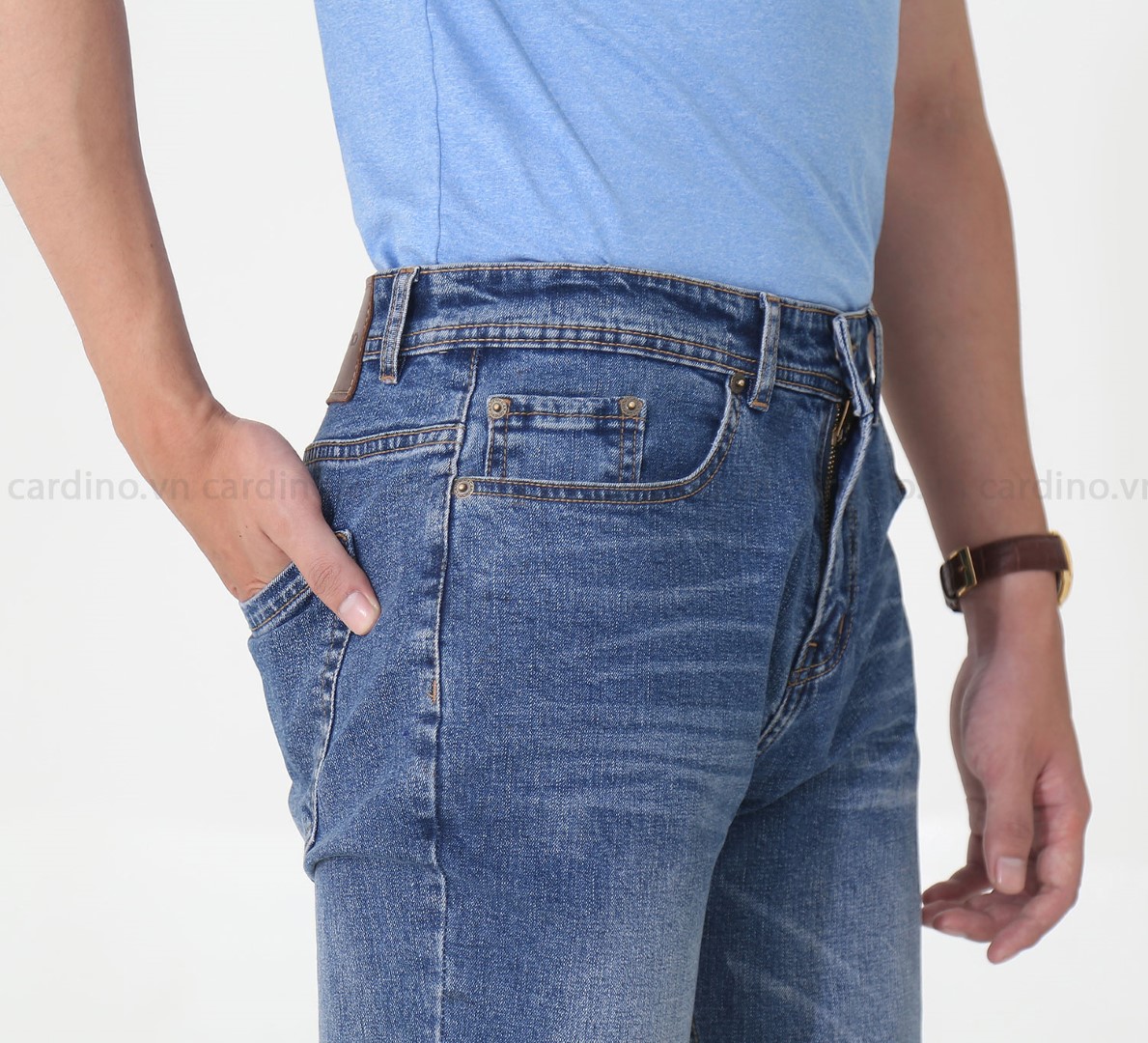Sản phẩm sử dụng chất liệu denim cao cấp với 95% cotton và 5% spandex mềm mại và không gây cộm cứng khó chịu, tạo điều kiện hoạt động tốt nhất cho người dụng.