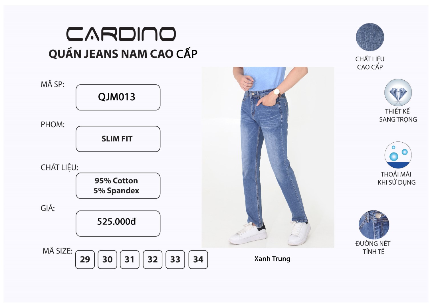 Được thiết kế kiểu dáng SLIM FIT, sản phẩm QJM014 là mẫu quần bò co giãn trẻ trung, năng động và không kém phần nam tính.