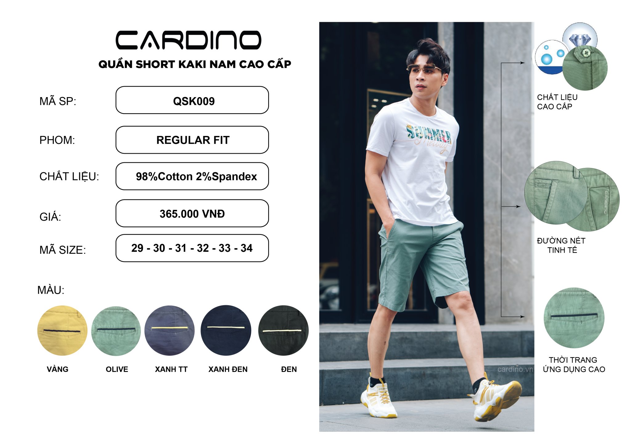 – Quần short kaki QSK009 được dệt từ chất liệu cao cấp, trong đó 97% Cotton mang lại cảm giác mềm mại, thoáng máng, thấm hút mồ hôi và dầu tốt. Còn lại, 2% Spandex làm tăng tính đàn hồi và độ bền cho sản phẩm.